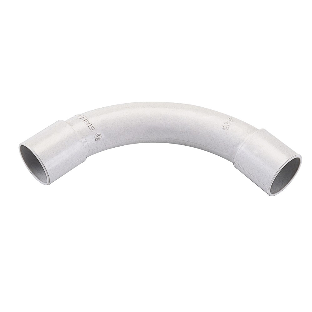 5 curve a 90° per tubi rigidi diametro 25 mm, IP40. Realizzate in materiale termoplastico autoestinguente ad alta resistenza meccanica. Colore: grigio. IP40: protezione contro i corpi solidi con diametro superiore a 1 mm.