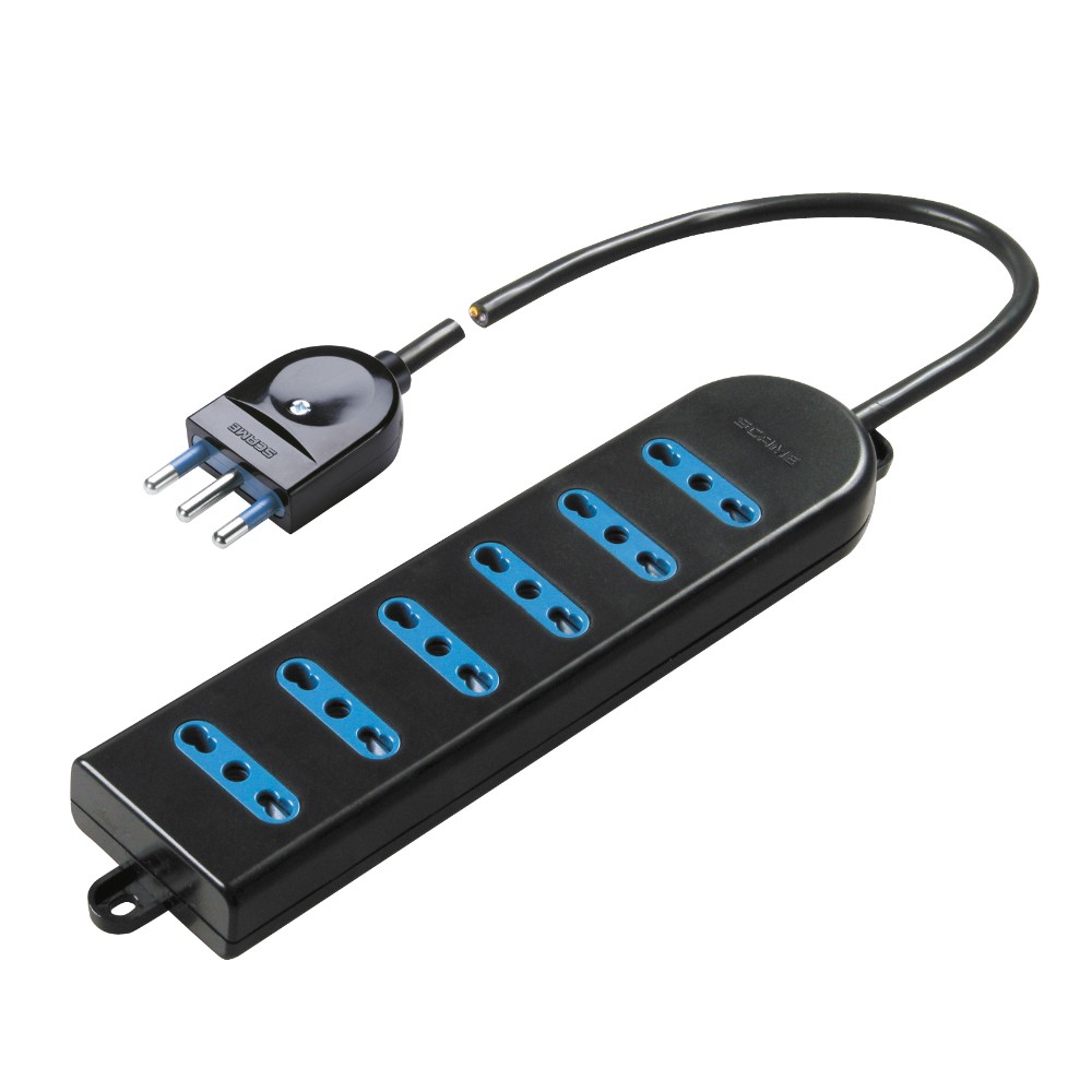 Presa multipla 250 V~ con 6 prese bivalenti 10 / 16 A 2P+T, 1,5 m cavo H05VV-F 3 X 1mm² con spina 16 A 2P+T. Colore: nero. Le prese bivalenti consentono il collegamento di tutte le spine standard italiano.