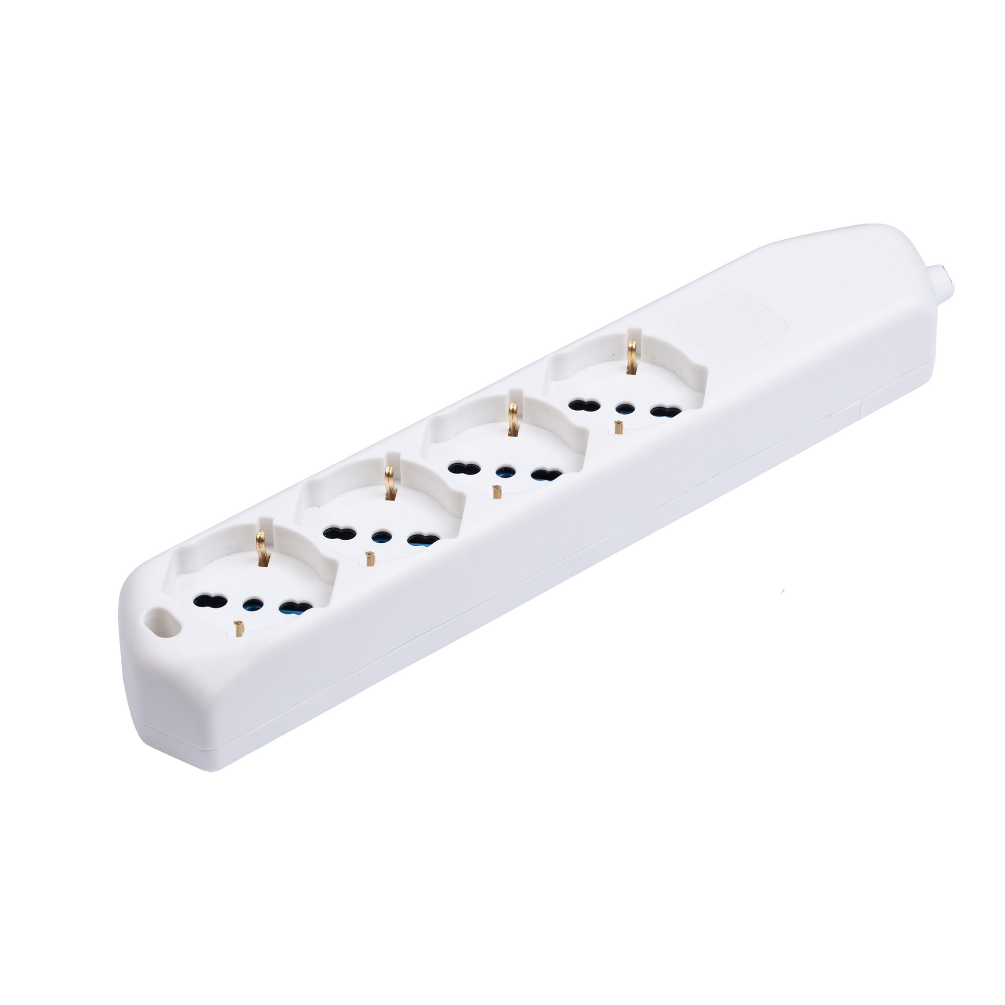 Presa multipla 250 V~ con 4 prese pluristandard 10 / 16 A 2P+T, standard italiano 10 / 16 A e tedesco 16 A (con terra laterale). Colore: bianco. Le prese pluristandard consentono il collegamento di tutte le spine standard italiano e tedesco, essendo inoltre inclinate di 45° facilitano l’inserimento di più spine ingombranti (es. alimentatori).