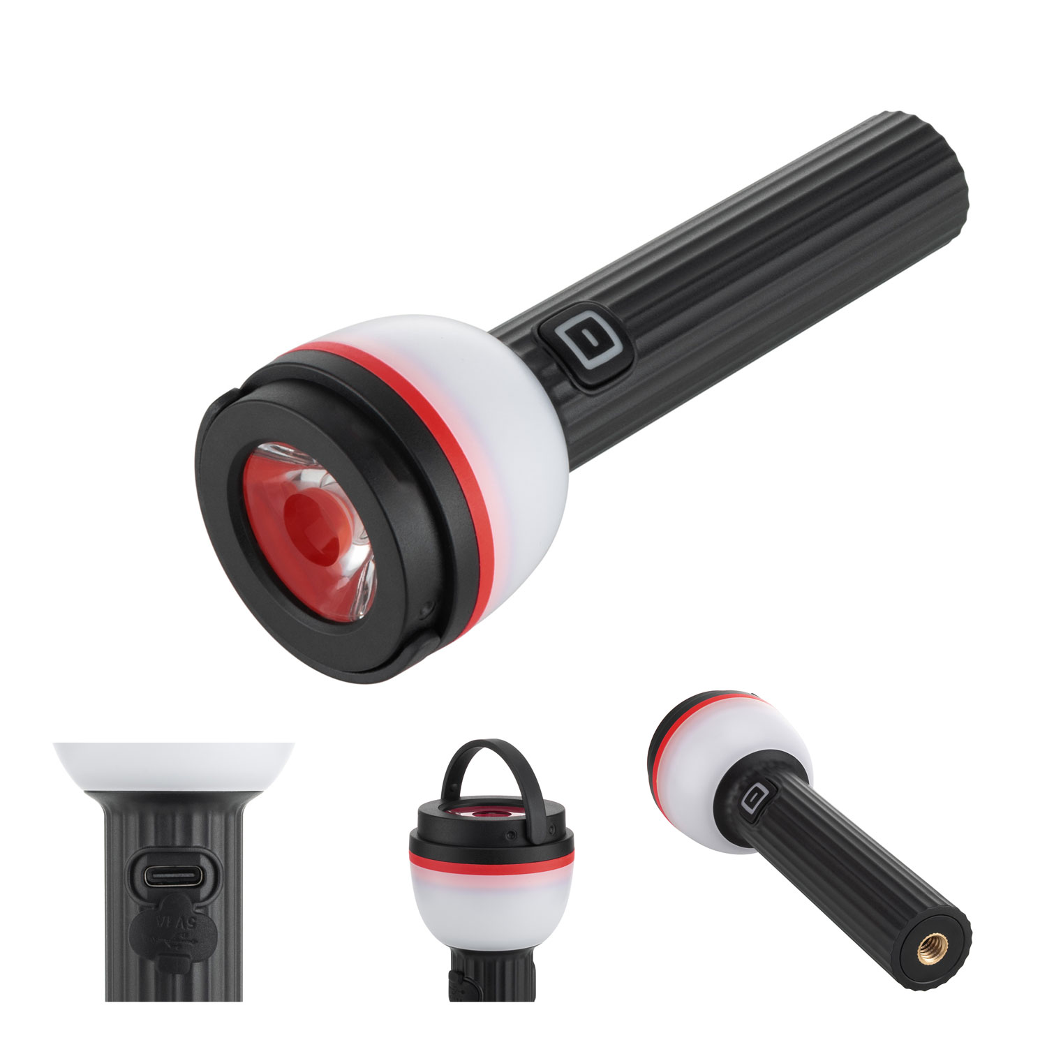 Torcia portatile ricaricabile LED 5W con torcia superiore max 160lm e torcia inferiore max 200lm. Alimentazione tramite batteria 3,7V 600mAh li-ion(inclusa). Dotata di presa USB 5V tipo C per la ricarica (cavetto USB incluso) e indicatore di ricarica. Torcia superiore: bassa luminosità (80lm) e alta luminosità (160lm), torcia inferiore: bassa luminosità 100lm, alta luminosità: 200lm. Provvista di gancio per appendere. Tempo di ricarica: 1,5h Autonomia: torcia superiore alta luminosità 2h, bassa luminosità 4h, torcia inferiore alta luminosità 1h, bassa luminosità 2h. Premere l’interruttore una volta per spegnere direttamente la luce scelta quando è accesa da più di 10″. Grado di protezione IP43: contro i corpi solidi con Ø superiore a 1mm e contro gli spruzzi di acqua. Garantisce una potente illuminazione ad un basso consumo, leggera e maneggevole ed è possibile appenderla tramite il comodo gancio che rende il suo utilizzo ideale per tutte le attività che necessitano di avere le mani libere in casa, garage, campeggio, durante escursioni ecc.