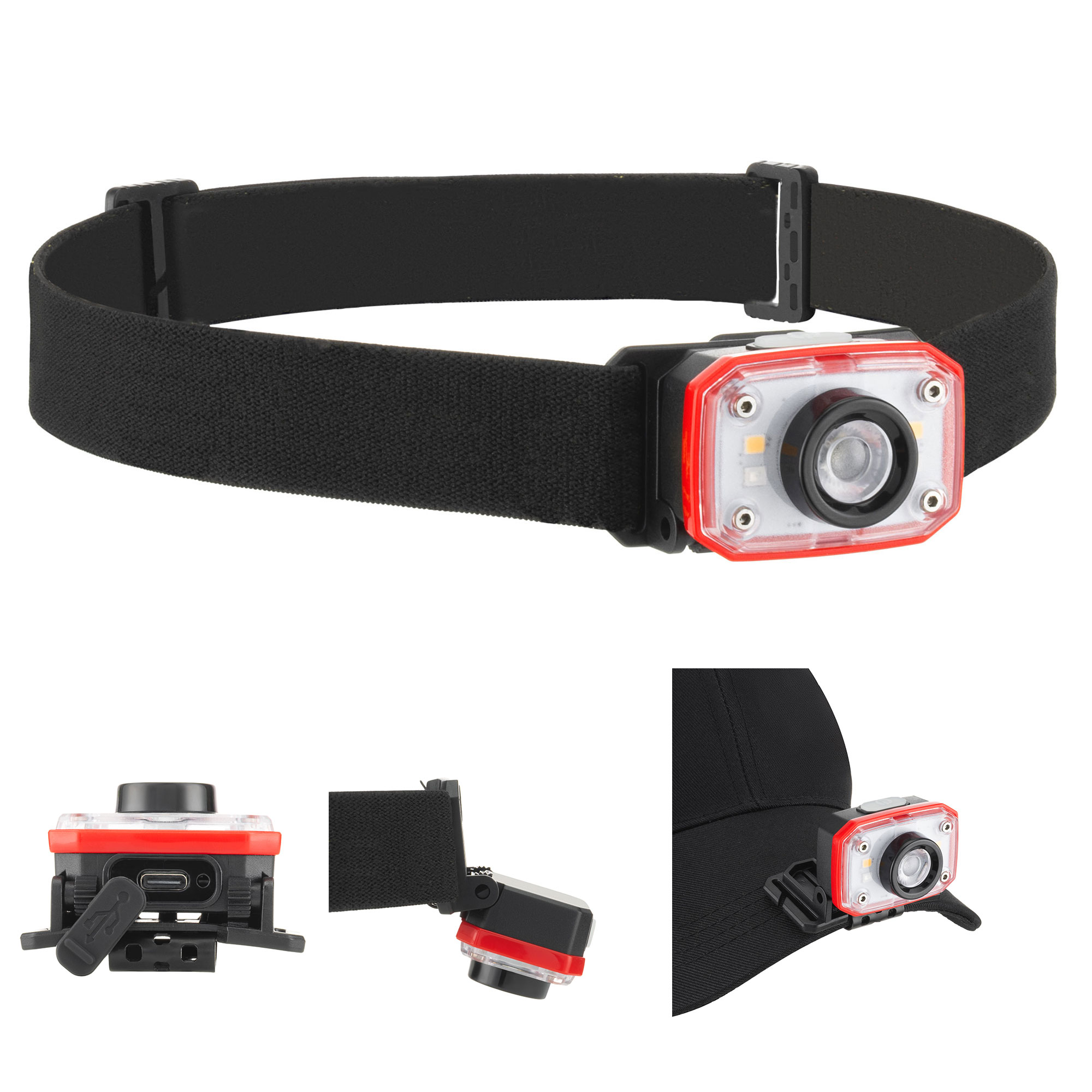 Lampada torcia da fronte LED 3W 350lm ricaricabile. Alimentazione tramite batteria 3.7V 200mAh Li-po. Provvista di presa USB tipo C 5V 0.5A per la ricarica (cavetto incluso.) Provvista di comoda fascia per la testa regolabile e flessibile, inclinazione regolabile e interruttore a pressione, che regola 5 funzioni di illuminazione: – luce fredda (105lm – 4h, 350lm- 1,5h) – luce calda (60lm – 3,5h) – luce rossa e luce rossa intermittente Pratica clip a molla per agganciare a cappellini con visiera, cinture, bicilette etc… Garantisce un’intensa illuminazione ad un basso consumo, è tascabile, leggera e confortevole quindi ideale per le attività all’aperto: nordic walking, jogging, escursionismo, sci ecc. e molto pratica per tutte le attività che necessitano di avere le mani libere: bricolage, campeggio ecc. IP44: protezione contro i corpi solidi con diametro superiore a 1 mm e contro gli spruzzi d’acqua.