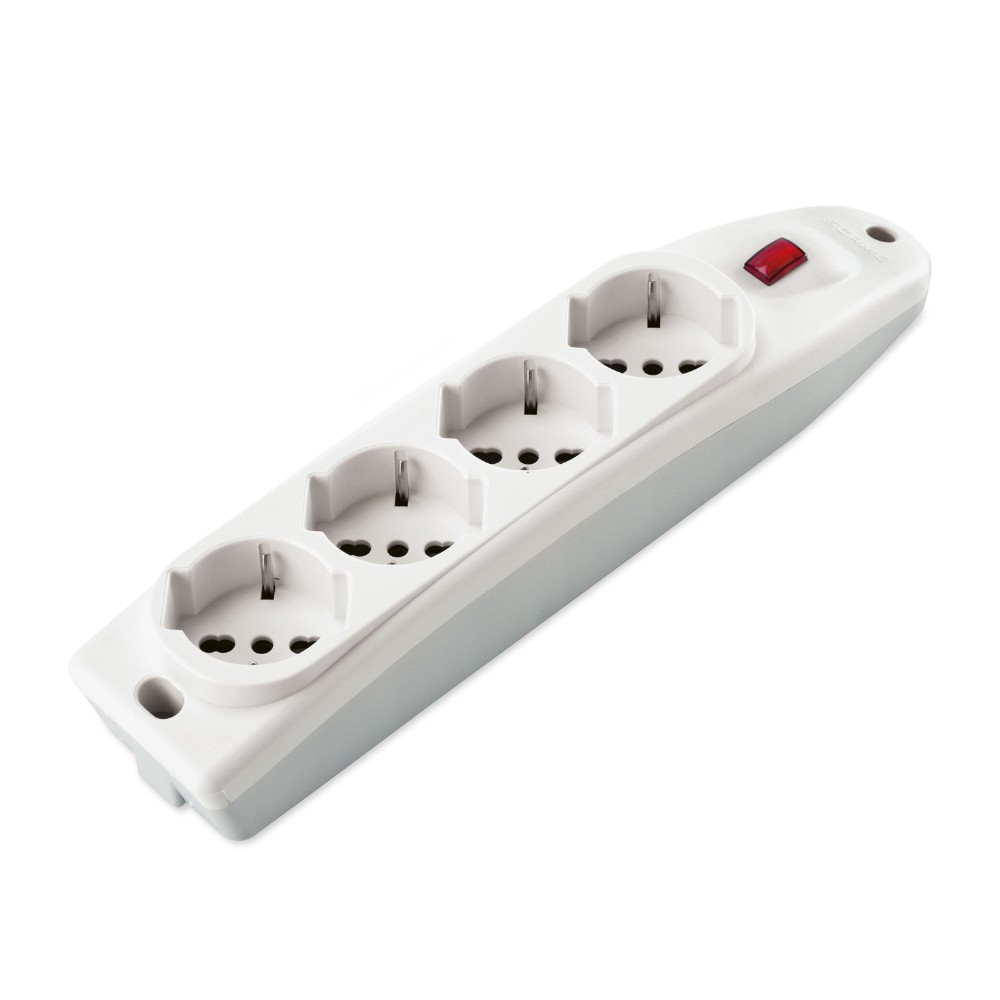 Presa multipla 250 V~ con 4 prese pluristandard 10 / 16 A 2P+T, standard italiano 10 / 16 A e tedesco 16 A (con terra laterale), interruttore luminoso. Colore: bianco. Le prese pluristandard consentono il collegamento di tutte le spine standard italiano e tedesco, essendo inoltre inclinate di 45° facilitano l’inserimento di più spine ingombranti (es. alimentatori). Spegnendo l’interruttore è inoltre possibile risparmiare energia elettrica ed eliminare lo stand-by dei dispositivi elettronici.