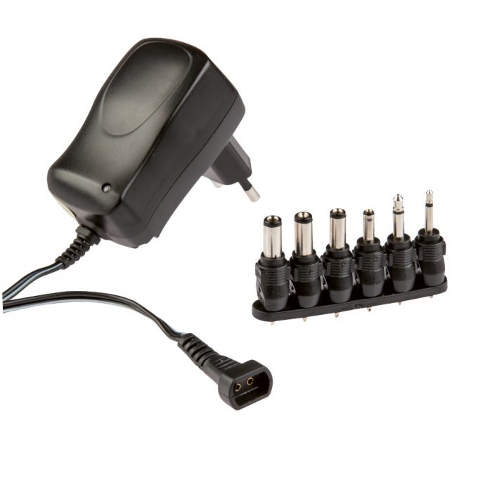Alimentatore universale stabilizzato con portata massima di 600 mA. Entrata: 230 V c.a. Uscita: 3 – 4,5 – 5 – 6 – 7,5 – 9 – 12 V c.c. Spina 10 A 2P 230 V~. Provvisto di selettore di tensione. Cavo da 1,8 m con connettore universale. Con n° 6 connettori inclusi per alimentare molteplici dispositivi. Isolato in classe II: non richiede il collegamento di messa a terra. Indicato per l’alimentazione di apparecchiature che necessitano, per caratteristiche costruttive, di tensioni stabilizzate.
