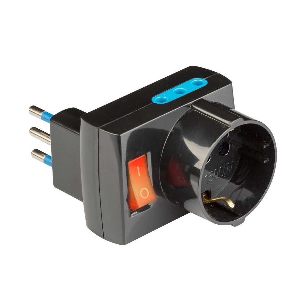 Adattatore con spina 10 A 2P+T, 2 prese 10 A 2P+T, 1 presa 10 – 16 A 2P+T (standard italiano 10 A e tedesco 16 A con terra laterale) 250 V~ e interruttore luminoso. Colore: nero. Le prese fuori asse permettono l’utilizzo di tutti i frutti presenti nella placca. Spegnendo l’interruttore è inoltre possibile risparmiare energia elettrica ed eliminare lo stand-by dei dispositivi elettronici.