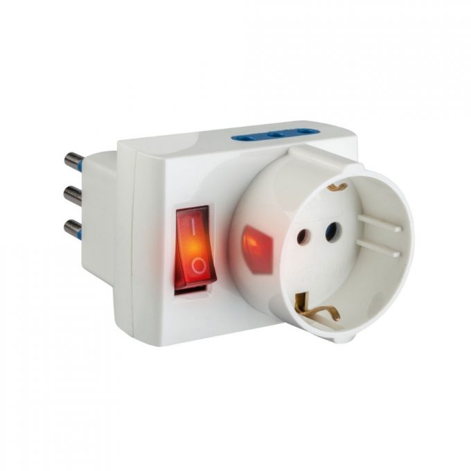 Adattatore con spina 10 A 2P+T, 2 prese 10 A 2P+T, 1 presa 10 – 16 A 2P+T (standard italiano 10 A e tedesco 16 A con terra laterale) 250 V~ e interruttore luminoso. Colore: bianco. Le prese fuori asse permettono l’utilizzo di tutti i frutti presenti nella placca. Spegnendo l’interruttore è inoltre possibile risparmiare energia elettrica ed eliminare lo stand-by dei dispositivi elettronici.