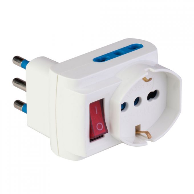 Adattatore con spina 16 A 2P+T, 2 prese bivalenti 10 / 16 A 2P+T, 1 presa pluristandard 10 / 16 A 2P+T (standard italiano 10 / 16 A e tedesco 16 A con terra laterale) 250 V~ e interruttore luminoso. Colore: bianco. Le prese fuori asse permettono l’utilizzo di tutti i frutti presenti nella placca. Le prese bivalenti consentono il collegamento di tutte le spine standard italiano. La presa pluristandard consente il collegamento di tutte le spine standard italiano e tedesco. Spegnendo l’interruttore è inoltre possibile risparmiare energia elettrica ed eliminare lo stand-by dei dispositivi elettronici.